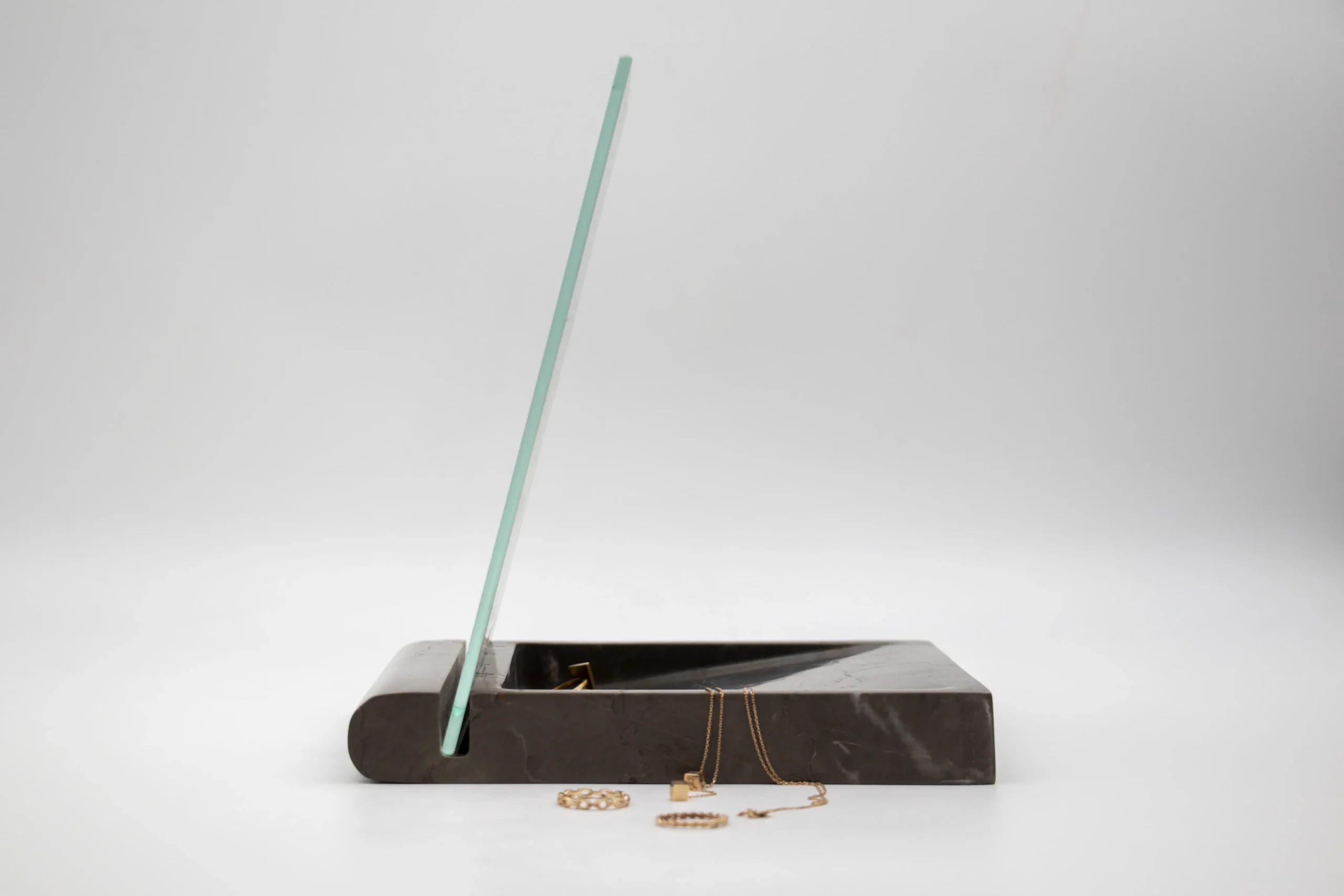 Vanity mirror with solid base and space for essentials.