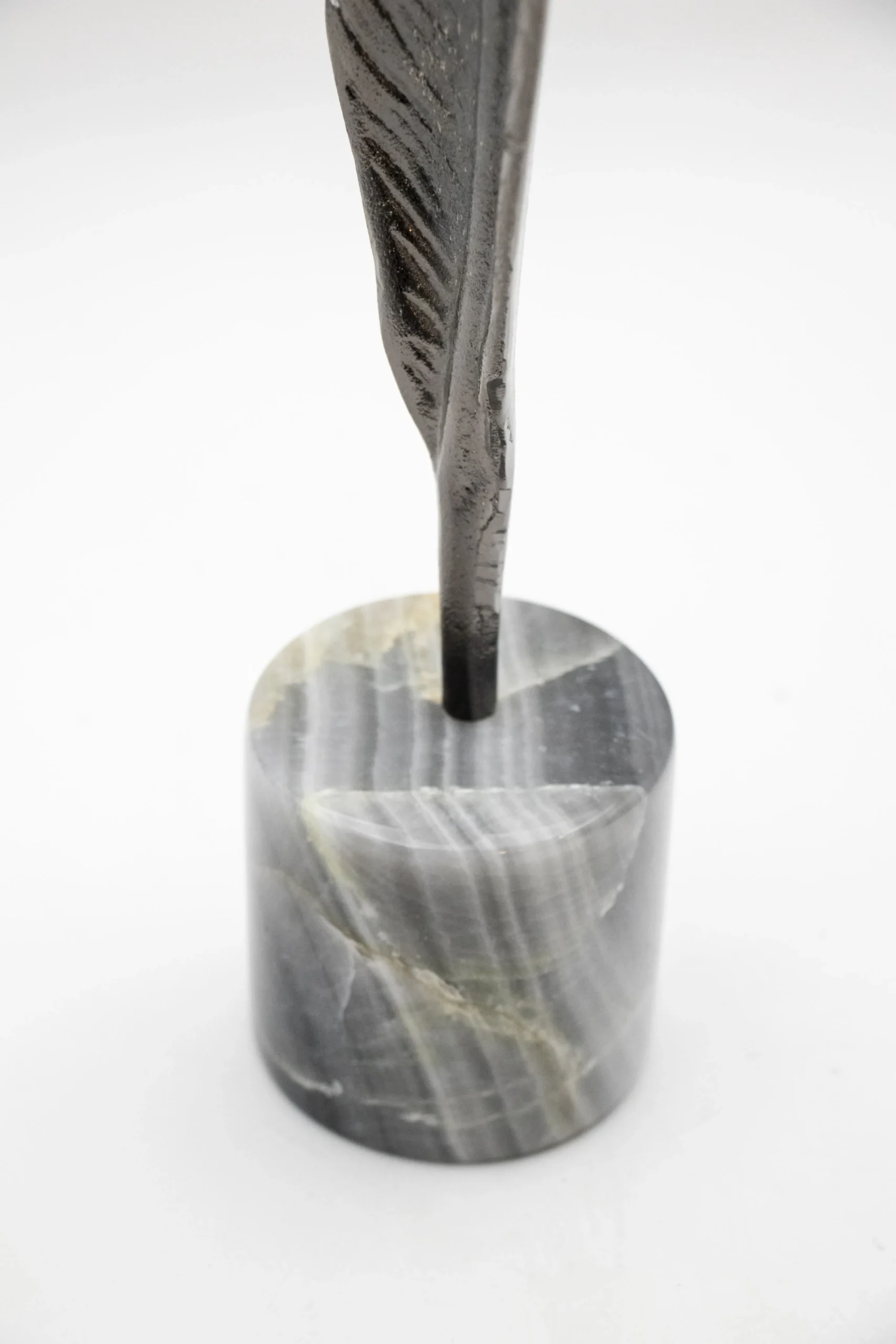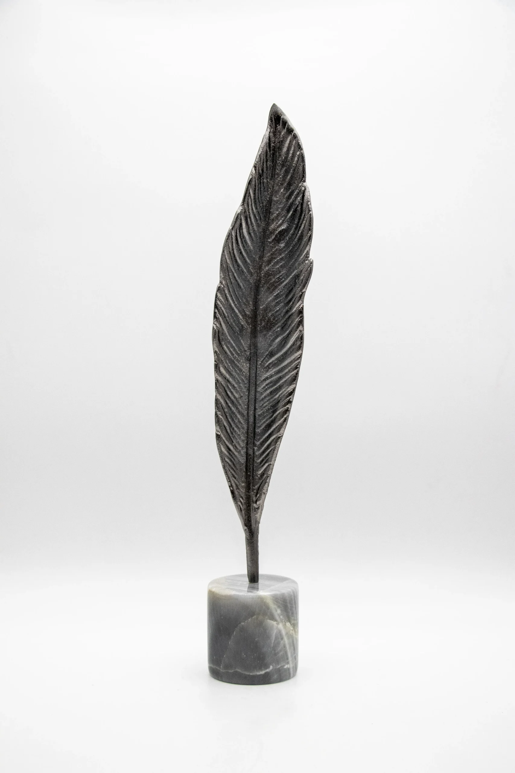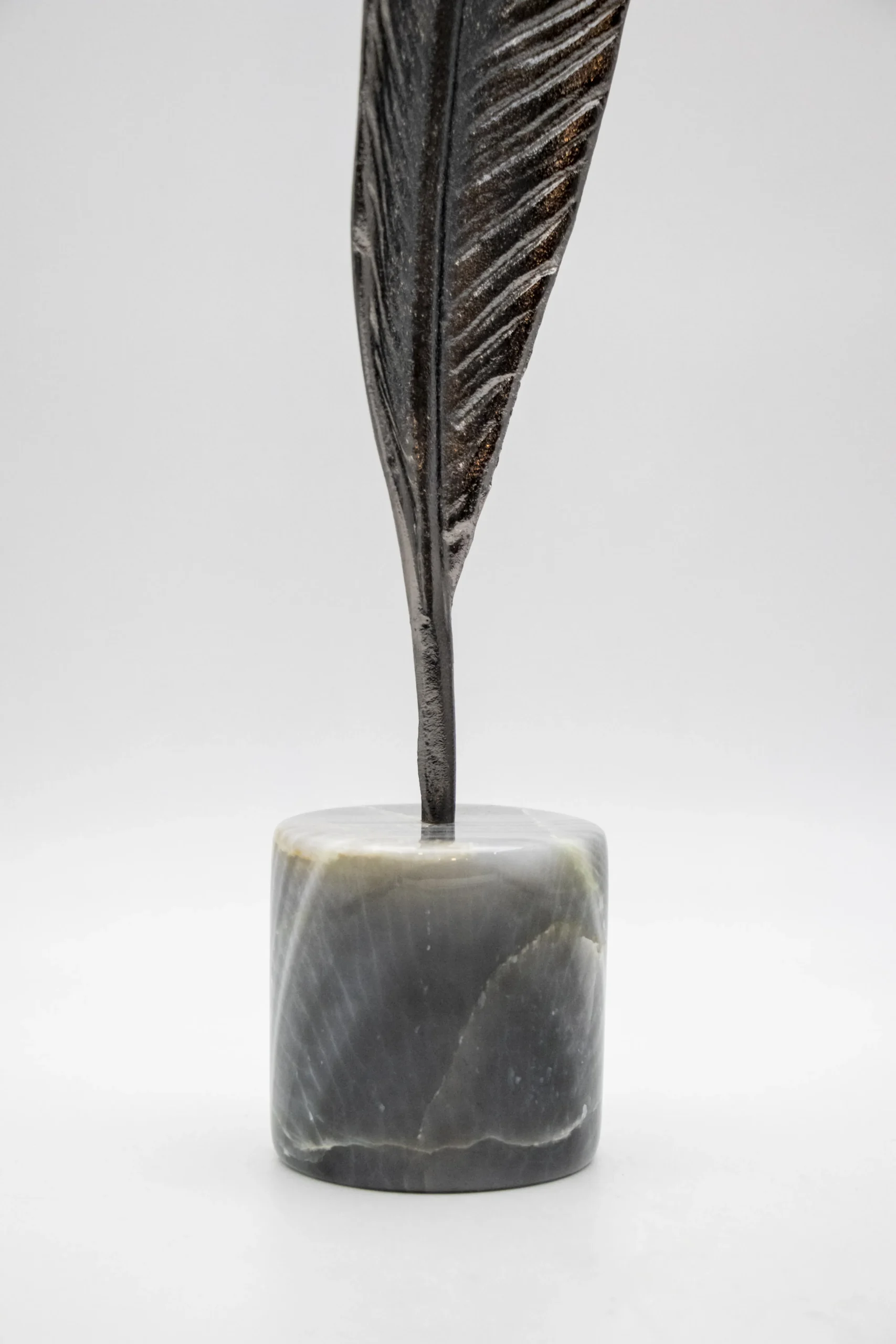Metallic feather sculpture on a stone base.