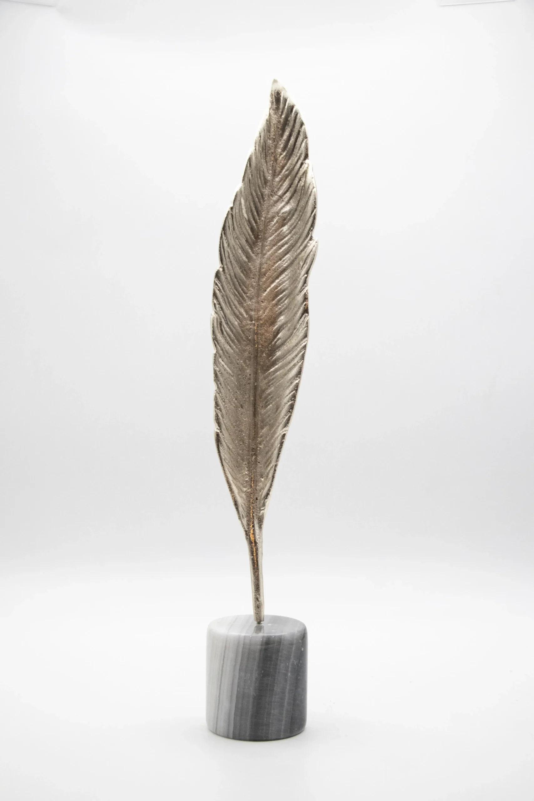 Metallic feather sculpture on a stone base.