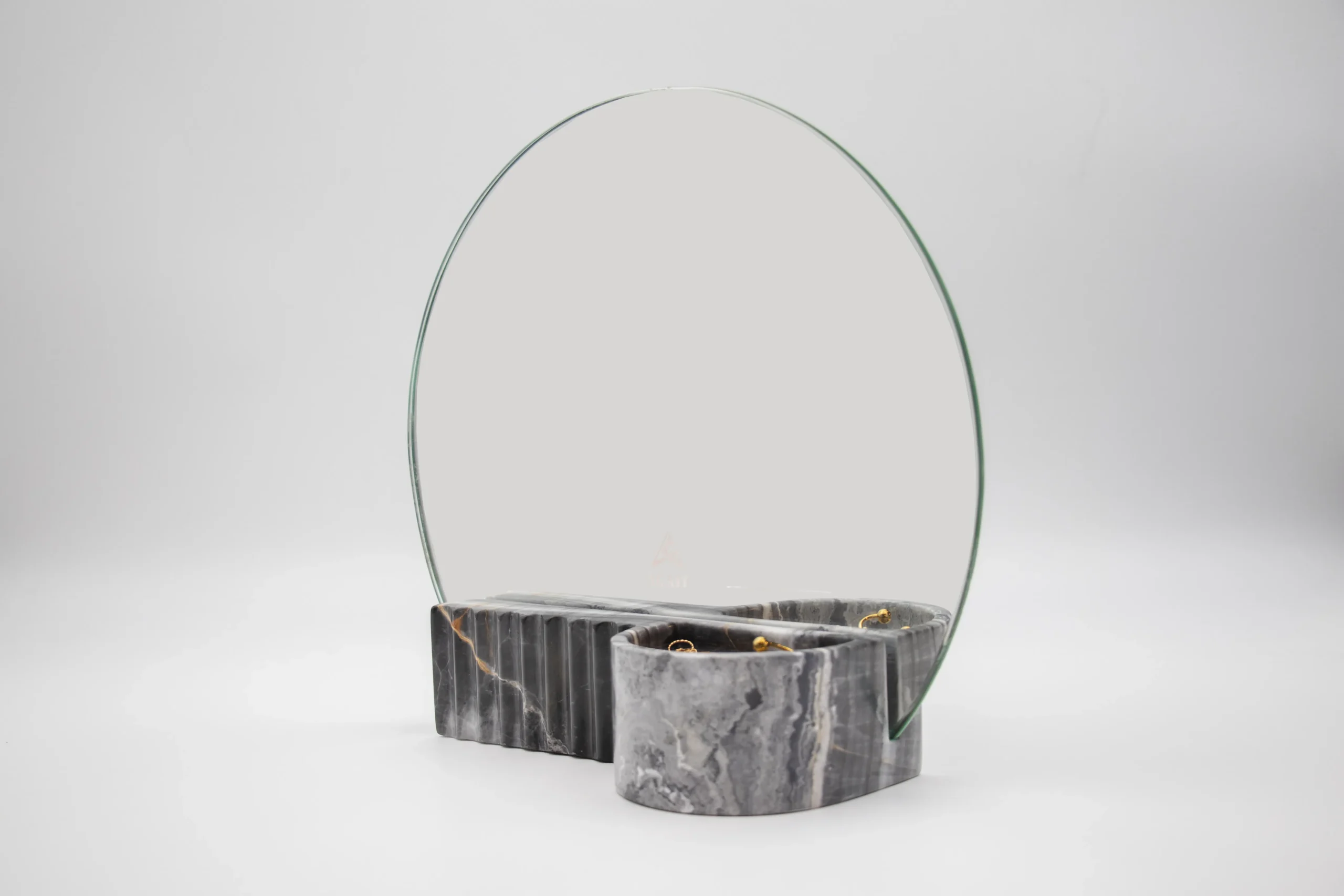 Circular mirror with divided tray for organizing jewelry.