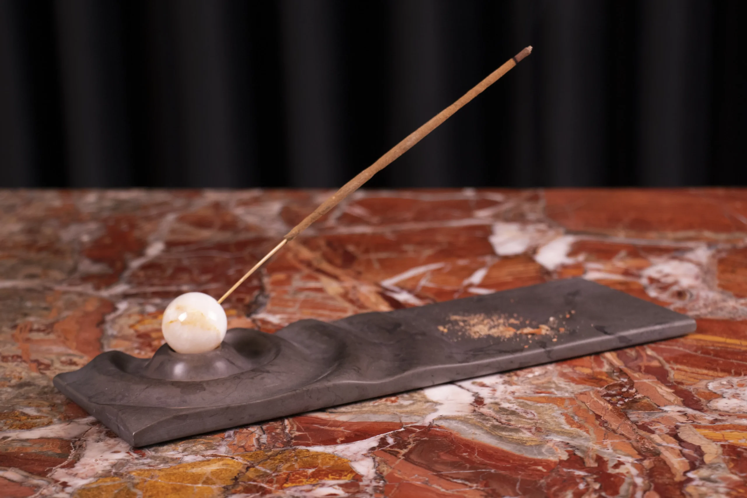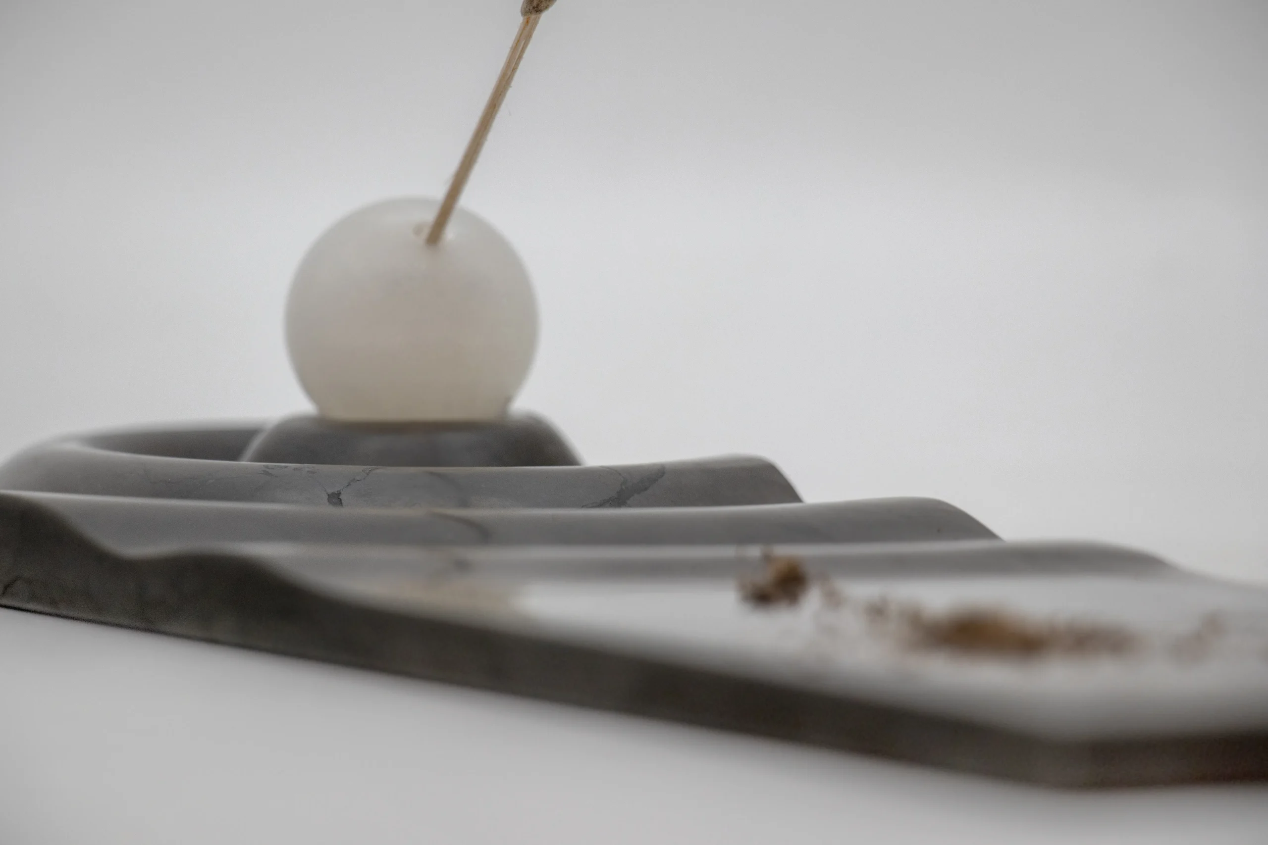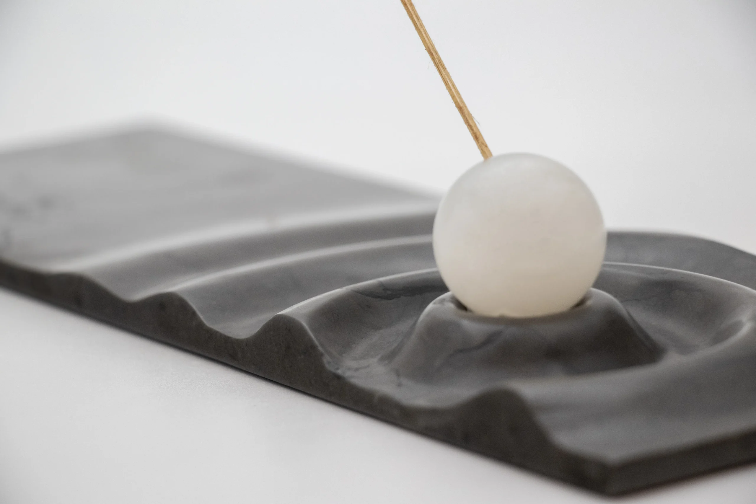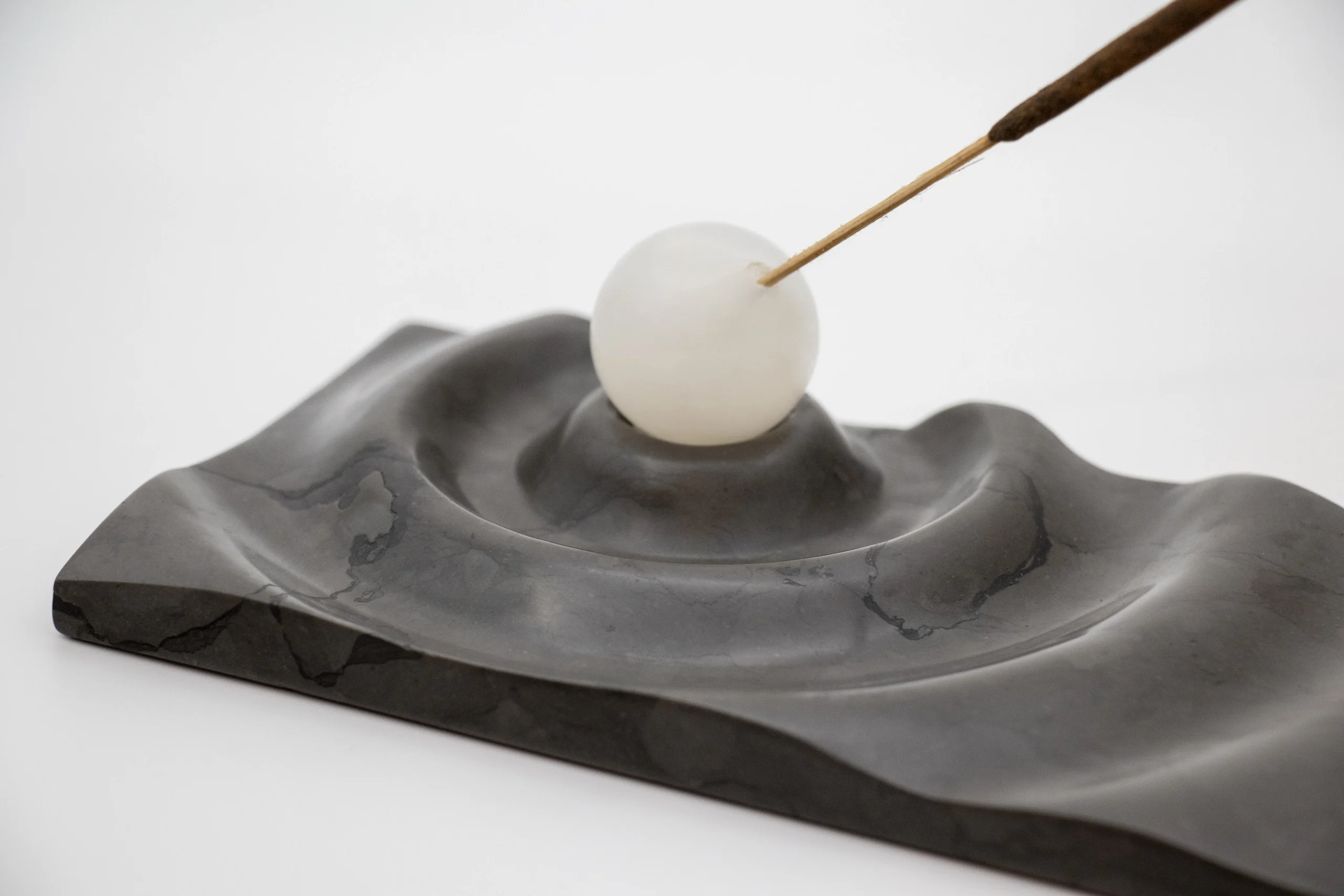 Incense holder with carved wave motif and minimal sphere.