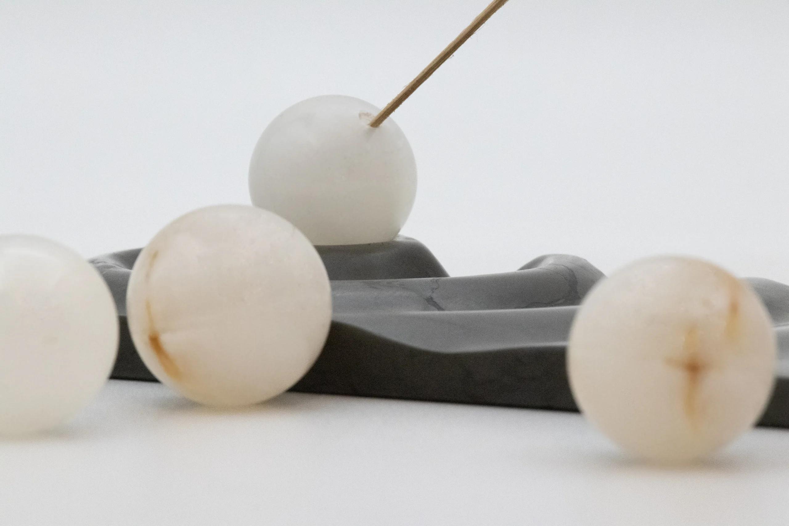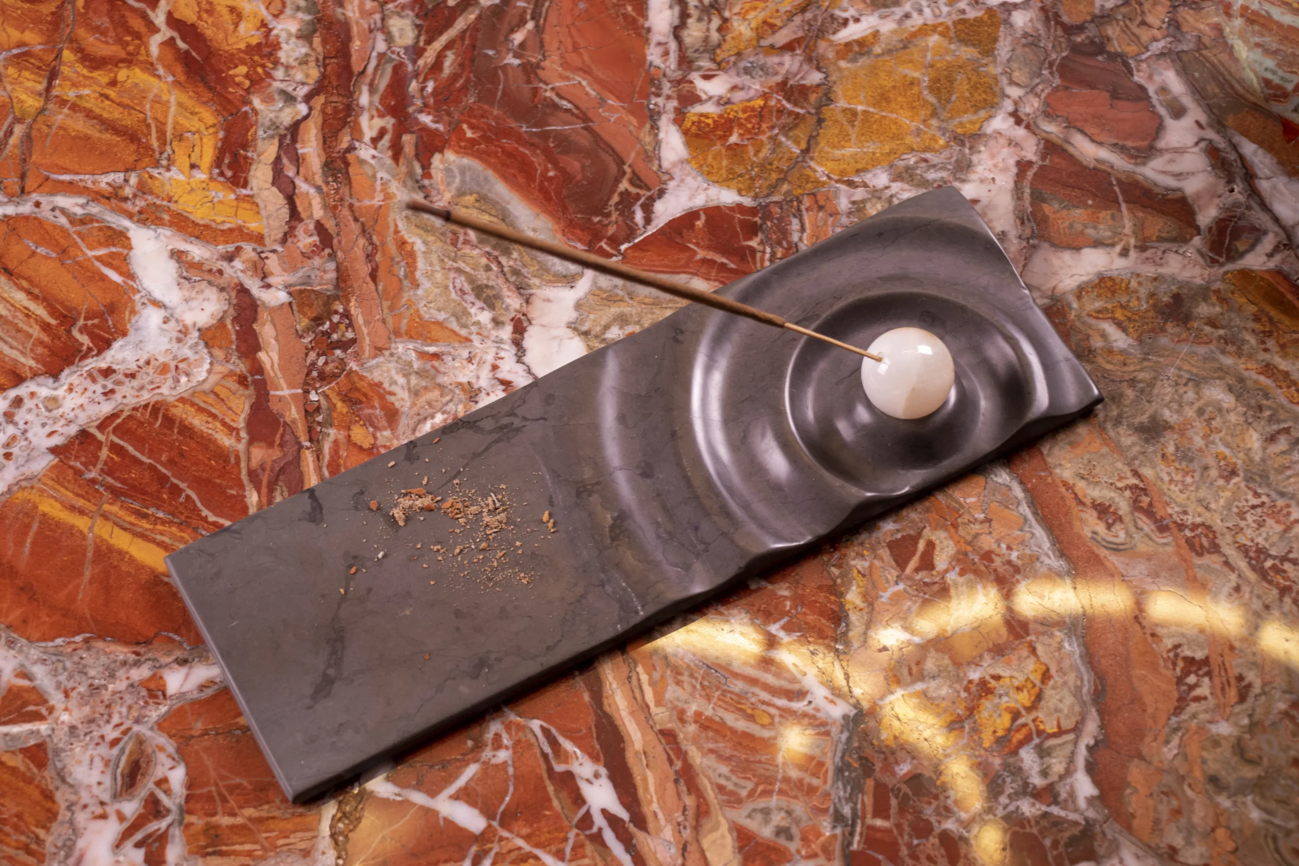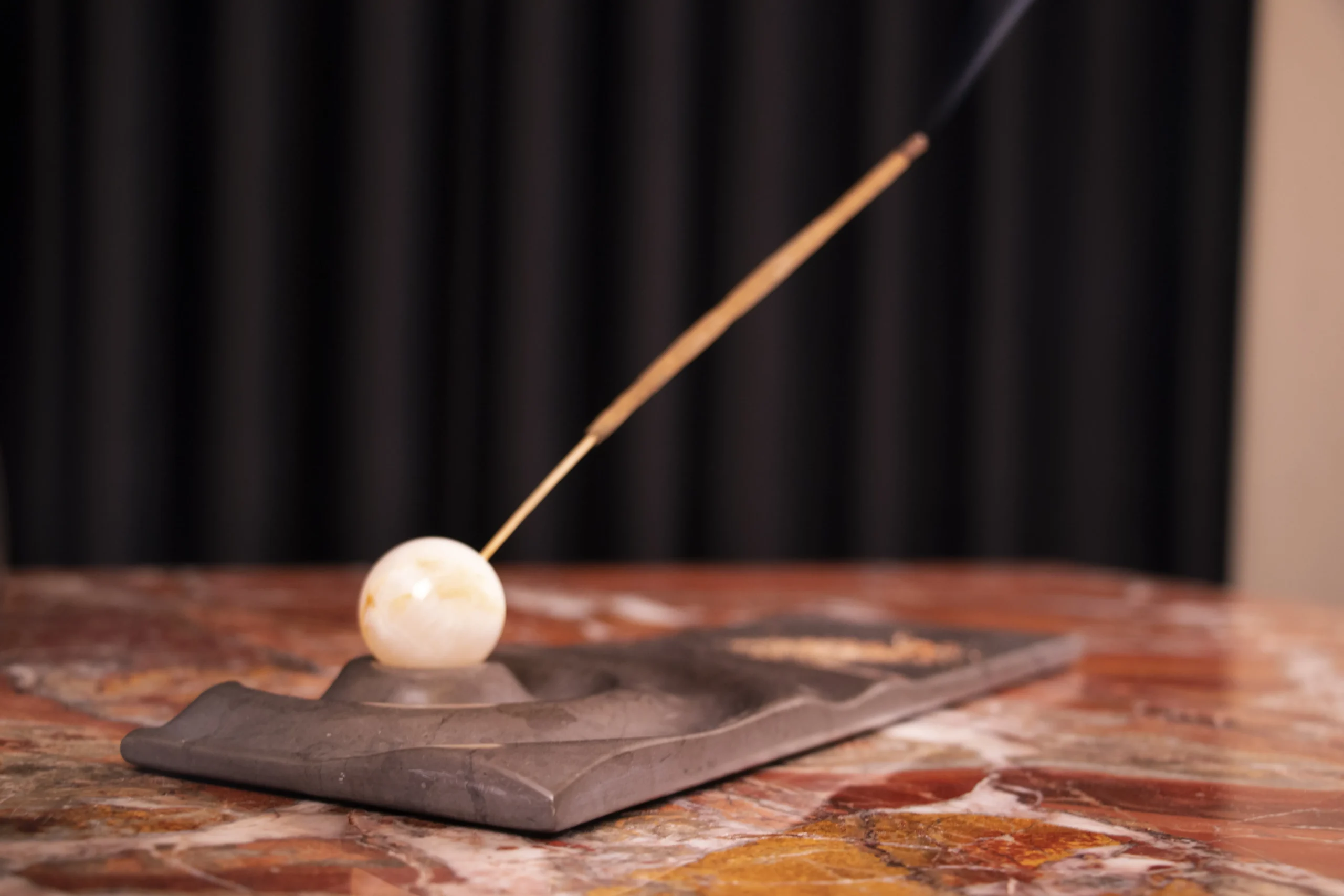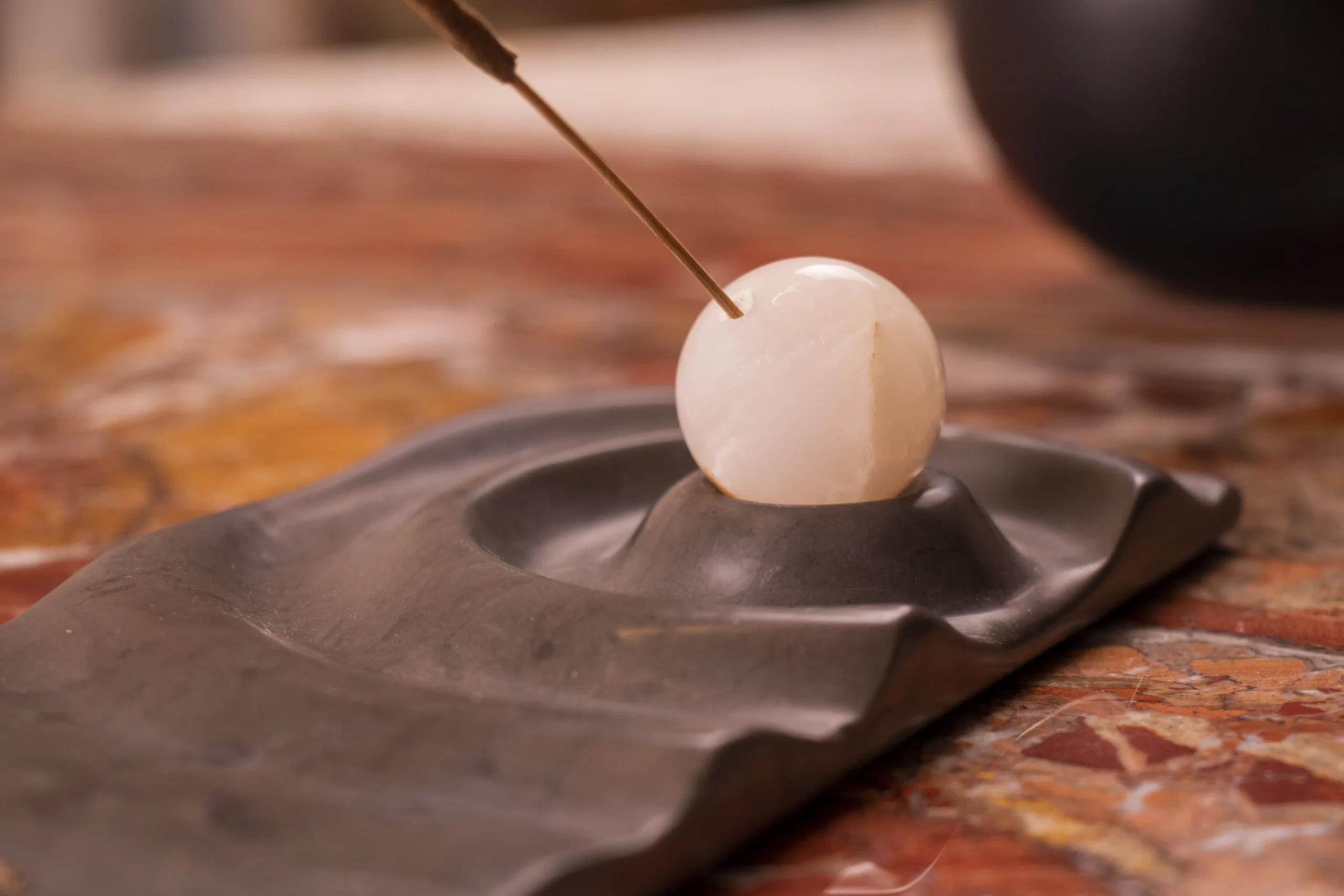 Incense holder with carved wave motif and minimal sphere.